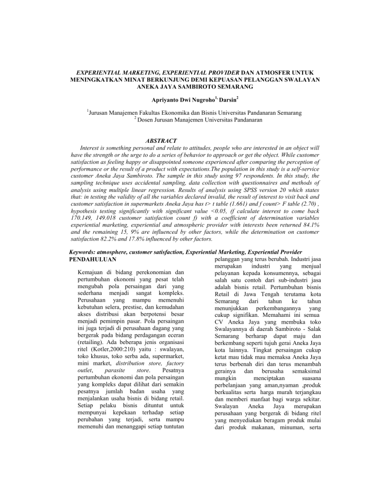 EXPERIENTIAL MARKETING, EXPERIENTIAL PROVIDER DAN ATMOSFER UNTUK MENINGKATKAN MINAT BERKUNJUNG DEMI KEPUASAN PELANGGAN SWALAYAN ANEKA JAYA SAMBIROTO SEMARANG Apriyanto Dwi Nugroho1, Darsin2 1 Jurusan Manajemen Fakultas Ekonomika dan Bisnis Universitas Pandanaran Semarang 2 Dosen Jurusan Manajemen Universitas Pandanaran ABSTRACT Interest is something personal and relate to attitudes, people who are interested in an object will have the strength or the urge to do a series of behavior to approach or get the object. While customer satisfaction as feeling happy or disappointed someone experienced after comparing the perception of performance or the result of a product with expectations.The population in this study is a self-service customer Aneka Jaya Sambiroto. The sample in this study using 97 respondents. In this study, the sampling technique uses accidental sampling, data collection with questionnaires and methods of analysis using multiple linear regression. Results of analysis using SPSS version 20 which states that: in testing the validity of all the variables declared invalid, the result of interest to visit back and customer satisfaction in supermarkets Aneka Jaya has t> t table (1.661) and f count> F table (2.70) , hypothesis testing significantly with significant value <0.05, (f calculate interest to come back 170.149, 149.018 customer satisfaction count f) with a coefficient of determination variables experiential marketing, experiential and atmospheric provider with interests been returned 84.1% and the remaining 15, 9% are influenced by other factors, while the determination on customer satisfaction 82.2% and 17.8% influenced by other factors. Keywords: atmosphere, customer satisfaction, Experiential Marketing, Experiential Provider pelanggan yang terus berubah. Industri jasa PENDAHULUAN merupakan industri yang menjual Kemajuan di bidang perekonomian dan pelayanan kepada konsumennya, sebagai pertumbuhan ekonomi yang pesat telah salah satu contoh dari sub-industri jasa mengubah pola persaingan dari yang adalah bisnis retail. Pertumbuhan bisnis sederhana menjadi sangat kompleks. Retail di Jawa Tengah terutama kota Perusahaan yang mampu memenuhi Semarang dari tahun ke tahun kebutuhan selera, prestise, dan kemudahan menunjukkan perkembangannya yang akses distribusi akan berpotensi besar cukup signifikan. Memahami ini semua menjadi pemimpin pasar. Pola persaingan CV Aneka Jaya yang membuka toko ini juga terjadi di perusahaan dagang yang Swalayannya di daerah Sambiroto - Salak bergerak pada bidang perdagangan eceran Semarang berharap dapat maju dan (retailing). Ada beberapa jenis organisasi berkembang seperti tujuh gerai Aneka Jaya ritel (Kotler,2000:210) yaitu : swalayan, kota lainnya. Tingkat persaingan cukup toko khusus, toko serba ada, supermarket, ketat mau tidak mau memaksa Aneka Jaya mini market, distribution store, factory terus berbenah diri dan terus menambah outlet, parasite store. Pesatnya gerainya dan berusaha semaksimal pertumbuhan ekonomi dan pola persaingan mungkin menciptakan suasana yang kompleks dapat dilihat dari semakin perbelanjaan yang aman,nyaman ,produk pesatnya jumlah badan usaha yang berkualitas serta harga murah terjangkau menjalankan usaha bisnis di bidang retail. dan memberi manfaat bagi warga sekitar. Setiap pelaku bisnis dituntut untuk Swalayan Aneka Jaya merupakan mempunyai kepekaan terhadap setiap perusahaan yang bergerak di bidang ritel perubahan yang terjadi, serta mampu yang menyediakan beragam produk mulai memenuhi dan menanggapi setiap tuntutan dari produk makanan, minuman, serta berbagai macam perlengkapan rumah tangga dengan beragam jenis variasi dan merek dengan slogan “Lebih Lengkap, Lebih Hemat, Lebih Dekat”. Produkproduknya pun beraneka ragam sesuai dengan slogan yang dimiliki, ini terlihat dari berbagai merek, ukuran, warna, serta kualitas produk tiap-tiap jenis yang ditawarkan oleh Swalayan Aneka Jaya Selain menawarkan ragam produk yang lengkap, pelayanan yang baik turut diusahakan oleh Swalayan Aneka Jaya Sambiroto dengan merekrut pramuniaga yang ramah, terampil dan memiliki pengetahuan produk yang lengkap, diikuti jam buka toko yang lumayan panjang yakni dari jam 09.00 hingga 21.00 WIB. Di samping itu perusahaan menugaskan karyawan untuk selalu memastikan kebersihan lantai dan ruangan setiap saat agar konsumen merasa nyaman ketika berbelanja. Persepsi nyaman juga dihasilkan dari pencahayaan dalam toko yang terang, iringan musik, aroma yang wangi. Strategi tersebut tentunya dimaksudkan untuk meningkatkan penjualan. Dalam hal ini swalayan aneka jaya dituntut untuk tetap bertahan dan meningkatkan jumlah pendapatan serta terciptanya loyalitas pelanggan. Strateginya adalah melalui experiential marketing,experintal provider dan minat berkunjung kembali. TINJAUAN PUSTAKA 1. Experiential Marketing Menurut Schmitt (2004:22) mengatakan bahwa experiential marketing adalah kemampuan dari suatu produk dalam menawarkanpengalaman emosi hingga menyentuh hati dan perasaan konsumen. 2. Experiential Provider Perangkat dari SEMs (Strategi Experience Moduls) dapat dibentuk melalui Expros (Experiential Providers). Expros sendiri merupakan alat taktis yang dapat membentuk Sense, Feel, Think, Act, dan Relate. 3. Atmosfer Menurut Kotler (2005), atmosfer adalah suasana terencana yang sesuai dengan pasar sasarannya dan yang dapat menarik konsumen untuk membeli. 4. Minat Berkunjung Kembali Fornell (2001) menyatakan bahwa konsumen atau pelanggan yang puas akan melakukan kunjungan ulang pada waktu yang akan datang dan memberitahukan kepada orang lain atas jasa yang dirasakan. Model lain dikemukakan oleh Betner & Spencer yaitu adanya perilaku masa lampau yang dapat mempengaruhi minat secara langsung dan perilaku mengkonsumsi ulang pada waktu yang akan datang. 5. Kepuasan Pelanggan Menurut Kotler (2003: 61) mendefinisikan kepuasan sebagai perasaan senang atau kecewa seseorang yang dialami setelah membandingkan antara persepsi kinerja atau hasil suatu produk dengan