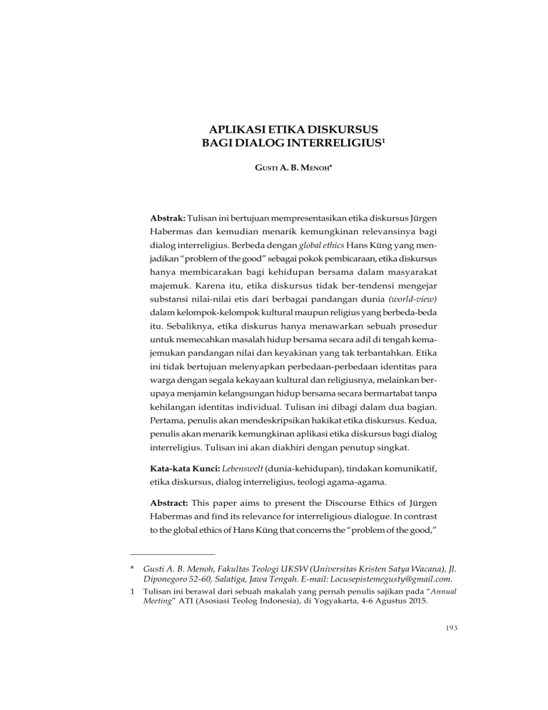 DISKURSUS, Volume 14, Nomor 2, Oktober 2015: 193-220 193 APLIKASI ETIKA DISKURSUS BAGI DIALOG INTERRELIGIUS1 GUSTI A. B. MENOH∗ Abstrak: Tulisan ini bertujuan mempresentasikan etika diskursus Jürgen Habermas dan kemudian menarik kemungkinan relevansinya bagi dialog interreligius. Berbeda dengan global ethics Hans Küng yang menjadikan “problem of the good” sebagai pokok pembicaraan, etika diskursus hanya membicarakan bagi kehidupan bersama dalam masyarakat majemuk. Karena itu, etika diskursus tidak ber-tendensi mengejar substansi nilai-nilai etis dari berbagai pandangan dunia (world-view) dalam kelompok-kelompok kultural maupun religius yang berbeda-beda itu. Sebaliknya, etika diskurus hanya menawarkan sebuah prosedur untuk memecahkan masalah hidup bersama secara adil di tengah kemajemukan pandangan nilai dan keyakinan yang tak terbantahkan. Etika ini tidak bertujuan melenyapkan perbedaan-perbedaan identitas para warga dengan segala kekayaan kultural dan religiusnya, melainkan berupaya menjamin kelangsungan hidup bersama secara bermartabat tanpa kehilangan identitas individual. Tulisan ini dibagi dalam dua bagian. Pertama, penulis akan mendeskripsikan hakikat etika diskursus. Kedua, penulis akan menarik kemungkinan aplikasi etika diskursus bagi dialog interreligius. Tulisan ini akan diakhiri dengan penutup singkat. Kata-kata Kunci: Lebenswelt (dunia-kehidupan), tindakan komunikatif, etika diskursus, dialog interreligius, teologi agama-agama. Abstract: This paper aims to present the Discourse Ethics of Jürgen Habermas and find its relevance for interreligious dialogue. In contrast to the global ethics of Hans Küng that concerns the “problem of the good,” * Gusti A. B. Menoh, Fakultas Teologi UKSW (Universitas Kristen Satya Wacana), Jl. Diponegoro 52-60, Salatiga, Jawa Tengah. E-mail: [email protected]. 1 Tulisan ini berawal dari sebuah makalah yang pernah penulis sajikan pada “Annual Meeting” ATI (Asosiasi Teolog Indonesia), di Yogyakarta, 4-6 Agustus 2015. 193 194 Aplikasi Etika Diskursus Bagi Dialog Interreligius (Gusti A. B. Menoh) discourse ethics deals only with “the problem of justice” within a pluralistic society. Therefore, discourse ethics does not attempt to find the commonality of the ethical different values of the various group either culturally or religiously. Rather, discourse ethics offers a procedure for solving inter-religion and inter-cultural problems within a community or society fairly and reasonably. In other words, discourse ethics does not aim to eliminate the distinctive attributes of every citizen within their own cultural and religious belief, but rather ensures that each person or each group live together with dignity without losing their identity. This paper is divided into two parts. First, the author will describe what discourse ethics is. Second, the authors will discuss the possible application of discourse ethics for interreligious dialogue. This paper will end with a short conclusion. Keywords: Lebenswelt (world-lives), communicative action, discourse ethics, interreligious dialogue, theology of religions. PENDAHULUAN Tentu masih hangat dalam ingatan kita, kasus kerusuhan Tolikara pada perayaan Idul Fitri di Papua, tanggal 17 Juli 2015 lalu, saat sebuah Mushola terbakar akibat perselisihan antarkelompok di sana. Persoalan semacam itu tentu bukan hal baru di tanah air. Pembatasan dan serangan kelompok tertentu atas minoritas Ahmadiyah, Syiah, dan lain sebagainya sangat lazim terjadi. Ekspansi kelompok agama garis keras di ruang-ruang publik dengan melakukan “sweeping” pada bulan-bulan suci keagamaan, dan di sepanjang waktu (mereka) merespon hal yang dianggap maksiat atau yang bertentangan dengan nilai-nilai yang mereka yakini dengan cara kekerasan sudah sering kita saksikan. Peraturan daerah bernuansa syariah yang menyimpan potensi kolonisasi doktrin komprehensif (pandangan keagamaan) tertentu atas kehidupan publik tampaknya tidak menjadi soal lagi di republik ini. Padahal, dalam kehidupan masyarakat di mana pun dewasa ini, kemajemukan pandangan dan keyakinan religius menjadi sebuah kenyataan yang tidak dapat dipungkiri. Berbagai pandangan dan keyakinan agama, budaya, moral, dan lain sebagainya begitu nyata dalam realitas sosial kita. Pandangan- DISKURSUS, Volume 14, Nomor 2, Oktober 2015: 193-220 195 pandangan ini, satu sama yang lain, tidak selalu sejalan, bahkan malah sering bertentangan. Dalam situasi ini, penataan hidup bersama dalam suatu tatanan sosial-politik menjadi tantangan serius. Masalahnya, selalu saja ada pihak yang berjuang memaksakan pandangan dunianya menjadi norma hidup bersama, berlaku bagi semua yang lain. Para pemikir dari masa ke masa mencoba menata kemajemukan berhadapan dengan pertanyaan-pertanyaan mendasar seperti: Apakah mungkin membangun suatu tatanan sosial yang baik atas dasar doktrin partikular tertentu (misalnya pandangan agama) di tengahtengah kehidupan masyarakat yang kompleks dan majemuk seperti saat ini? Bagaimana kita harus memahami kehidupan politik (hidup bersama) dalam terang tantangan-tantangan perbedaan moral dan religius? Ketika para warga dengan perbedaan-perbedaan keyakinan etis atau religius bertengkar dalam debat publik, bagaimana mengatasi pertentangan-pertentangan seperti itu secara konstruktif? Bagaimana membangun suatu basis yang stabil dan sahi bagi suatu kehidupan bersama dalam masyarakat plural? Sejauh mana harus diberi ruang bagi kelompok-kelompok atau komunitas-komunitas partikular religius untuk mengekspresikan pandangan, praktik dan cara hidup mereka?2 Jürgen Habermas (1929-...), salah satu filsuf besar Jerman mencoba menangani persoalan pluralitas itu melalui etika diskursus. Dengan etika diskursus, Habermas ingin menangani pluralitas pandangan moral, kultural, keagamaan yang begitu kompleks dalam masyarakat modern dewasa ini. Motif utama etika diskursus tidak lain adalah melakukan apa yang menjadi tugas utama segenap etika, yaitu melindungi manusia dalam keutuhan martab