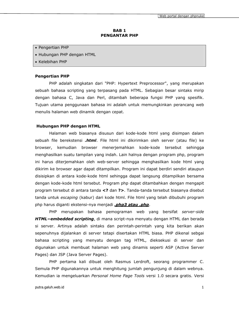 Web portal dengan phpnuke BAB 1 PENGANTAR PHP • Pengertian PHP • Hubungan PHP dengan HTML • Kelebihan PHP Pengertian PHP PHP adalah singkatan dari "PHP: Hypertext Preprocessor", yang merupakan sebuah bahasa scripting yang terpasang pada HTML. Sebagian besar sintaks mirip dengan bahasa C, Java dan Perl, ditambah beberapa fungsi PHP yang spesifik. Tujuan utama penggunaan bahasa ini adalah untuk memungkinkan perancang web menulis halaman web dinamik dengan cepat. Hubungan PHP dengan HTML Halaman web biasanya disusun dari kode-kode html yang disimpan dalam sebuah file berekstensi .html. File html ini dikirimkan oleh server (atau file) ke browser, kemudian browser menerjemahkan kode-kode tersebut sehingga menghasilkan suatu tampilan yang indah. Lain halnya dengan program php, program ini harus diterjemahkan oleh web-server sehingga menghasilkan kode html yang dikirim ke browser agar dapat ditampilkan. Program ini dapat berdiri sendiri ataupun disisipkan di antara kode-kode html sehingga dapat langsung ditampilkan bersama dengan kode-kode html tersebut. Program php dapat ditambahkan dengan mengapit program tersebut di antara tanda <? dan ?>. Tanda-tanda tersebut biasanya disebut tanda untuk escaping (kabur) dari kode html. File html yang telah dibubuhi program php harus diganti ekstensi-nya menjadi .php3 atau .php. PHP merupakan bahasa pemograman web yang bersifat server-side HTML=embedded scripting, di mana script-nya menyatu dengan HTML dan berada si server. Artinya adalah sintaks dan perintah-perintah yang kita berikan akan sepenuhnya dijalankan di server tetapi disertakan HTML biasa. PHP dikenal sebgai bahasa scripting yang menyatu dengan tag HTML, dieksekusi di server dan digunakan untuk membuat halaman web yang dinamis seperti ASP (Active Server Pages) dan JSP (Java Server Pages). PHP pertama kali dibuat oleh Rasmus Lerdroft, seorang programmer C. Semula PHP digunakannya untuk menghitung jumlah pengunjung di dalam webnya. Kemudian ia mengeluarkan Personal Home Page Tools versi 1.0 secara gratis. Versi putra.galuh.web.id 1 Web portal dengan phpnuke ini pertama kali keluar pada tahun 1995. Isinya adalah sekumpulan script PERL yang dibuatnya untuk membuat halaman webnya menjadi dinamis. Kemudian pada tahun 1996 ia mengeluarkan PHP versi 2.0 yang kemampuannya telah dapat mengakses database dan dapat terintegrasi dengan HTML. Pada tahun 1998 tepatnya pada tanggal 6 Juni 1998 keluarlah PHP versi 3.0 yang dikeluarkan oleh Rasmus sendiri bersama kelompok pengembang softwarenya.. Versi terbaru, yaitu PHP 4.0 keluar pada tanggal 22 Mei 2000 merupakan versi yang lebih lengkap lagi dibandingkan dengan versi sebelumnya. Perubahan yang paling mendasar pada PHP 4.0 adalah terintegrasinya Zend Engine yang dibuat oleh Zend Suraski dan Andi Gutmans yang merupakan penyempurnaan dari PHP scripting engine. Yang lainnya adalah build in HTTP session, tidak lagi menggunakan library tambahan seperti pada PHP. Tujuan dari bahasa scripting ini adalah untuk membuat aplikasi-aplikasi yang dijalankan di atas teknologi web. Dalam hal ini, aplikasi pada umumnya akan memberikan hasil pada web browser, tetapi prosesnya secara keseluruhan dijalankan web server. Kelebihan PHP Ketika e-commerce semakin berkembang, situs-situs yang statispun semakin ditinggalkan, karena dianggap sudah tidak memenuhi keinginan pasar, padahal situs tersebut harus tetap dinamis. Pada saat ini bahasa PERL dan CGI sudah jauh ketinggalan jaman sehingga sebagian besar designer web banyak beralih ke bahasa server-side scripting yang lebih dinamis seperti PHP. Seluruh aplikasi berbasis web dapat dibuat dengan PHP. Namun kekuatan yang paling utama PHP adalah pada konektivitasnya dengan system database di dalam web. Sistem database yang dapat didukung oleh PHP adalah : 1. Oracle 2. MySQL 3. Sybase 4. PostgreSQL 5. dan lainnya PHP dapat berjalan di berbagai system operasi seperti windows 98/NT, UNIX/LINUX, solaris maupun macintosh. PHP merupakan software yang open source yang dapat anda download secara gratis dari situs resminya yaitu http://www.php.net, ataupun dari situs-situs yang menyediakan software tersebut seperti di ftp://gerbang.che.itb.ac.id. putra.galuh.web.id 2 Web portal dengan phpnuke Software ini juga dapat berjalan pada web server seperti PWS (Personal Web Server), Apache, IIS, AOLServer, fhttpd, phttpd dan sebagainya. PHP juga merupakan bahasa pemograman yang dapat kita kembangkan sendiri seperti untuk menambah fungsi-fungsi baru. Keunggulan lainnya dari PHP adalah bahwa PHP juga mendukung komunikasi dengan layanan seperti protocol IMAP, SNMP, NNTP, POP3 dan bahkan HTTP. PHP dapat diinstal sebagai bagian atau modul dari apache web server atau sebagai CGI script yang mandiri. Banyak keuntungan yang dapat diperoleh jika menggunakan PHP sebagai modul dari apache, di antaranya adalah : 1. Tingkat keamanan yang cukup tinggi 2. Waktu eksekusi yang lebih cepat dibandingkan dengan bahasa pemograman web lainnya yang berorientasi pada server-side scripting. 3. Akses ke system database yang lebih fleksibel. seperti MySQL. Dalam modul ini kita akan mempelajari PHP sebagai server-side scripting yang menggunakan apache sebagai webserver. Versi PHP yang kita gunakan adalah PHP4 untuk Windows. putra.galuh.web.id 3 Web portal dengan phpnuke BAB 2 INSTALASI WEBSERVER • Pendahuluan • Instalasi Pendahuluan Web server merupakan server internet yang mampu melayani koneksi transfer data dalam protocol HTTP. Web server merupakan hal yang terpenting dari server di internet dibandingkan server lainnya seperti e-mail server, ftp server ataupun news server. Hal ini disebabkan web server telah dirancang untuk dapat melayani beragam jenis data, dari text sampai grafis 3 dimensi. Kemampuan ini telah menyebabkan berbagai institusi seperti universitas maupun perusahaan dapat menerima kehadirannya dan juga sekaligus menggunakannya sebagai sarana di internet. Web server juga dapat menggabungkan dengan dunia mobile wireless internet atau yang sering disebut seba