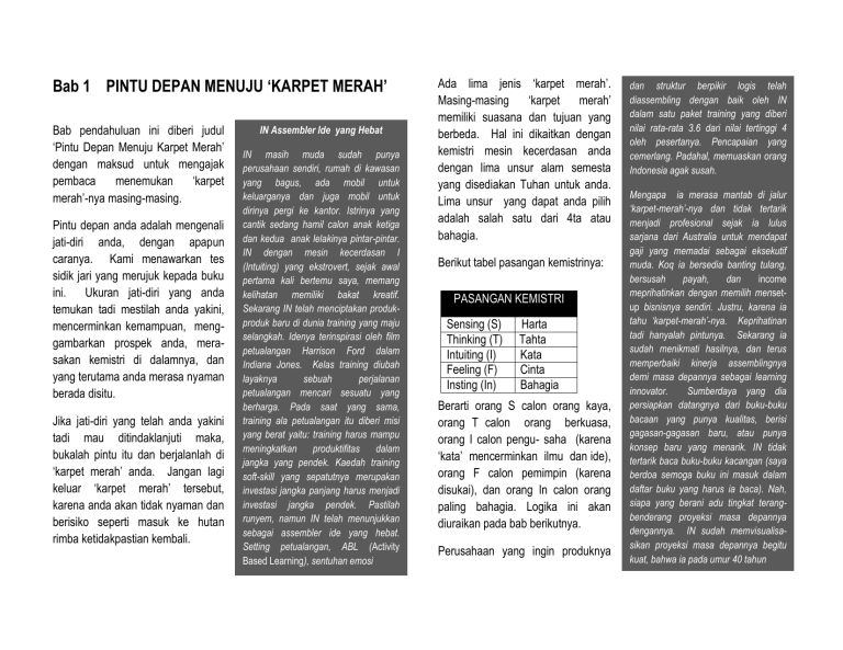 Bab 1 PINTU DEPAN MENUJU ‘KARPET MERAH’ Bab pendahuluan ini diberi judul ‗Pintu Depan Menuju Karpet Merah‘ dengan maksud untuk mengajak pembaca menemukan ‗karpet merah‘-nya masing-masing. Pintu depan anda adalah mengenali jati-diri anda, dengan apapun caranya. Kami menawarkan tes sidik jari yang merujuk kepada buku ini. Ukuran jati-diri yang anda temukan tadi mestilah anda yakini, mencerminkan kemampuan, menggambarkan prospek anda, merasakan kemistri di dalamnya, dan yang terutama anda merasa nyaman berada disitu. Jika jati-diri yang telah anda yakini tadi mau ditindaklanjuti maka, bukalah pintu itu dan berjalanlah di ‗karpet merah‘ anda. Jangan lagi keluar ‗karpet merah‘ tersebut, karena anda akan tidak nyaman dan berisiko seperti masuk ke hutan rimba ketidakpastian kembali. IN Assembler Ide yang Hebat IN masih muda sudah punya perusahaan sendiri, rumah di kawasan yang bagus, ada mobil untuk keluarganya dan juga mobil untuk dirinya pergi ke kantor. Istrinya yang cantik sedang hamil calon anak ketiga dan kedua anak lelakinya pintar-pintar. IN dengan mesin kecerdasan I (Intuiting) yang ekstrovert, sejak awal pertama kali bertemu saya, memang kelihatan memiliki bakat kreatif. Sekarang IN telah menciptakan produkproduk baru di dunia training yang maju selangkah. Idenya terinspirasi oleh film petualangan Harrison Ford dalam Indiana Jones. Kelas training diubah layaknya sebuah perjalanan petualangan mencari sesuatu yang berharga. Pada saat yang sama, training ala petualangan itu diberi misi yang berat yaitu: training harus mampu meningkatkan produktifitas dalam jangka yang pendek. Kaedah training soft-skill yang sepatutnya merupakan investasi jangka panjang harus menjadi investasi jangka pendek. Pastilah runyem, namun IN telah menunjukkan sebagai assembler ide yang hebat. Setting petualangan, ABL (Activity Based Learning), sentuhan emosi Ada lima jenis ‗karpet merah‘. Masing-masing ‗karpet merah‘ memiliki suasana dan tujuan yang berbeda. Hal ini dikaitkan dengan kemistri mesin kecerdasan anda dengan lima unsur alam semesta yang disediakan Tuhan untuk anda. Lima unsur yang dapat anda pilih adalah salah satu dari 4ta atau bahagia. Berikut tabel pasangan kemistrinya: PASANGAN KEMISTRI Sensing (S) Thinking (T) Intuiting (I) Feeling (F) Insting (In) Harta Tahta Kata Cinta Bahagia Berarti orang S calon orang kaya, orang T calon orang berkuasa, orang I calon pengu- saha (karena ‗kata‘ mencerminkan ilmu dan ide), orang F calon pemimpin (karena disukai), dan orang In calon orang paling bahagia. Logika ini akan diuraikan pada bab berikutnya. Perusahaan yang ingin produknya dan struktur berpikir logis telah diassembling dengan baik oleh IN dalam satu paket training yang diberi nilai rata-rata 3.6 dari nilai tertinggi 4 oleh pesertanya. Pencapaian yang cemerlang. Padahal, memuaskan orang Indonesia agak susah. Mengapa ia merasa mantab di jalur „karpet-merah‟-nya dan tidak tertarik menjadi profesional sejak ia lulus sarjana dari Australia untuk mendapat gaji yang memadai sebagai eksekutif muda. Koq ia bersedia banting tulang, bersusah payah, dan income meprihatinkan dengan memilih mensetup bisnisnya sendiri. Justru, karena ia tahu „karpet-merah‟-nya. Keprihatinan tadi hanyalah pintunya. Sekarang ia sudah menikmati hasilnya, dan terus memperbaiki kinerja assemblingnya demi masa depannya sebagai learning innovator. Sumberdaya yang dia persiapkan datangnya dari buku-buku bacaan yang punya kualitas, berisi gagasan-gagasan baru, atau punya konsep baru yang menarik. IN tidak tertarik baca buku-buku kacangan (saya berdoa semoga buku ini masuk dalam daftar buku yang harus ia baca). Nah, siapa yang berani adu tingkat terangbenderang proyeksi masa depannya dengannya. IN sudah memvisualisasikan proyeksi masa depannya begitu kuat, bahwa ia pada umur 40 tahun laku harus dapat memilih bintang akan menjadi keynote speaker pada iklan yang sesuai dengan targetnya. sebuah forum tentang learning tingkat Dian Sastro (karena orang S) bagus internasional di forum yang punya grade untuk iklan yang menargetkan tertinggi di hadapan orang-orang terhebat di dunia learning. Bahkan ia volume penjualan. Sandra Dewi sudah membayangkan gerakan tangan (karena orang T) sesuai untuk dan matanya yang berbinar-binar. meningkatkan wibawa produk. Bukan untuk mendahului Tuhan. Tetapi Mulan Jameela (karena orang I) itulah „karpet merah‟ yang sedang ia cocok untuk pencitraan berkelas upayakan. Dan Tuhan Maha Adil. Telah tergambar cetak-biru seorang IN atau peningkatan kualitas. Agnes sebagai learning innovator, dari Monica (karena orang F) dapat kacamata seorang manusia. diandalkan untuk mencari popularitas. Sherina (karena orang In) dapat dipilih untuk segmen pasar semua kalangan. Pengkhususan tadi dikaitkan dengan pasangan kemistri yang bersangkutan dengan unsur-unsur yang dapat ditarik. Setiap orang, sebagai bakat, hanya memiliki satu dari 4ta atau bahagia. Satu yang mana, sangat terkait dengan mesin kecerdasan yang bersangkutan. Baginya, untuk merebut yang punyanya sendiri jauh lebih mudah. Sedangkan untuk merebut punyanya orang lain, bukan tidak bisa, tetapi susah menguras energi dan waktu. Misalnya orang S ingin bahagia. Ia tetap akan merasa susah bahagia kalau ia miskin tidak punya apa-apa. Tidak akan sama dengan orang In yang tetap masih mungkin bahagia meski punya harta separuhnya orang S. Dalam ratusan sesi training (sebagian besar diikuti perusahaan kelas menengah-atas) yang telah dilakukan oleh Kubik terbukti bahwa STIFIn Personality telah membantu ribuan peserta training untuk mengurus karir (atau membenahi hidup) mereka. Konsep lima jenis mesin kecerdasan yaitu S (Sensing), T (Thinking), I (Intuiting), F (Feeling), dan In (Insting) telah mencerahkan mereka bahwa ternyata boleh jadi hidup mereka tidak efektif, karena belum menggunakan mesin kecerdasan mereka. Sebagian besar peserta training pada akhirnya merasa hidup kembali karena merasa telah menemukan dirinya yang asli. Buku ini diharapka