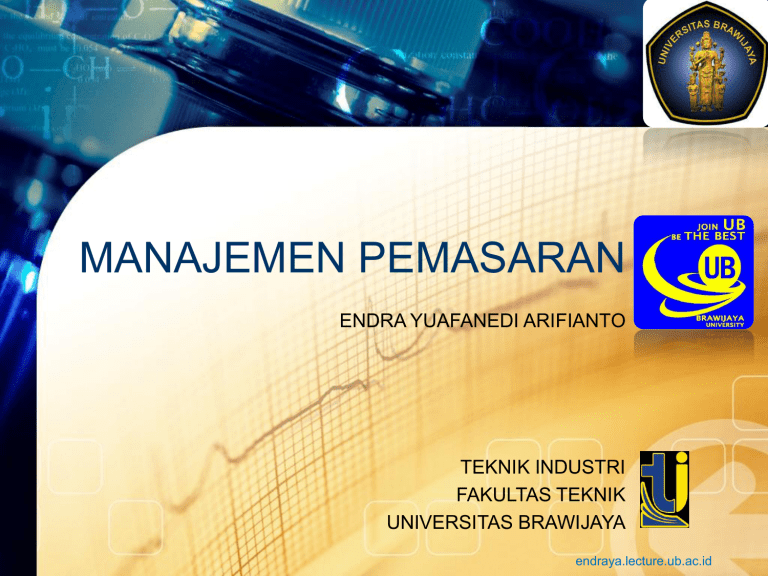 LOGO MANAJEMEN PEMASARAN ENDRA YUAFANEDI ARIFIANTO TEKNIK INDUSTRI FAKULTAS TEKNIK UNIVERSITAS BRAWIJAYA endraya.lecture.ub.ac.id LOGO MATERI PEMASARAN 1.Why is marketing important? 2.What is the scope of marketing? 3.What are some fundamental marketing concepts? 4.How has marketing management changed in recent years? 5.What are the task necessary for successful marketing management? endraya.lecture.ub.ac.id LOGO DEFINISI Marketing is the activity, set of institutions, and processes for creating, communicating, delivering, and exchanging offers that have value for customers, clients, partners, and society at large. Pemasaran adalah suatu proses sosial yang didalamnya individu dan kelompok mendapatkan apa yang mereka butuhkan dan inginkan dengan menciptakan, menawarkan dan secara bebas mempertukarkan produk yang bernilai dengan pihak lain endraya.lecture.ub.ac.id LOGO DEFINISI Marketing management is the art and science of choosing target markets and getting, keeping, and growing customers through creating, delivering, and communicating superior customer value. Manajemen Pemasaran adalah proses perencanaan dan pelaksanaan pemikiran, penetapan harga, promosi serta penyaluran gagasan, barang dan jasa untuk menciptakan pertukaran yang memenuhi saran-saran individu dan organisasi. endraya.lecture.ub.ac.id LOGO What is Marketed? Experiences Events Properties Organizations Information Ideas Persons Goods Services Places endraya.lecture.ub.ac.id LOGO Who markets? Response Attention Purchase Donation Vote Marketer Prospect endraya.lecture.ub.ac.id LOGO Types of Demand Unwholesome Irregular Negative Declining • • • • Nonexistent Latent Full Overfull endraya.lecture.ub.ac.id LOGO Markets endraya.lecture.ub.ac.id LOGO Simple Marketing System endraya.lecture.ub.ac.id LOGO Key Customer Markets Global Markets Consumer Market Business Markets Government Market endraya.lecture.ub.ac.id LOGO Markets Marketplaces Marketspaces Metamarkets endraya.lecture.ub.ac.id LOGO Core Marketing Concepts Needs, Wants, and Demands Target Markets, Positioning, and Segmentation Offerings and Brands Value and Satisfaction endraya.lecture.ub.ac.id LOGO Core Marketing Concepts Marketing Channels Supply Chain Marketing Environment Competition endraya.lecture.ub.ac.id LOGO The New Marketing Realities Globalization Information Technology Collect Information New Company Capabilities Major Societal Forces Consumer Information Communicate /Customer Increased Competition Differentiate Goods endraya.lecture.ub.ac.id LOGO Who is Responsible for Marketing? Entire Organization Marketing Department Chief Marketing Officer (CMO) endraya.lecture.ub.ac.id LOGO Marketing Concepts Quality Innovation Production Product Mass production Mass distribution Create, deliver, and communicate value Selling Marketing Holistic Unsought goods Overcapacity endraya.lecture.ub.ac.id LOGO Holistic Marketing Dimensions endraya.lecture.ub.ac.id LOGO Relationship Marketing Build long-term relationships Develop marketing networks endraya.lecture.ub.ac.id LOGO Integrated Marketing Create, communicate, and deliver customer value endraya.lecture.ub.ac.id LOGO Internal Marketing endraya.lecture.ub.ac.id LOGO Performance Marketing Social Responsibility Financial Accountability endraya.lecture.ub.ac.id LOGO The Four P’s of the Marketing Mix endraya.lecture.ub.ac.id LOGO Marketing Management Tasks Developing market strategies and plans Capturing marketing insights Connecting with customers Building strong brands Shaping market offerings Delivering value Communicating value Creating long-term growth endraya.lecture.ub.ac.id LOGO Join UB Be The Best endraya.lecture.ub.ac.id