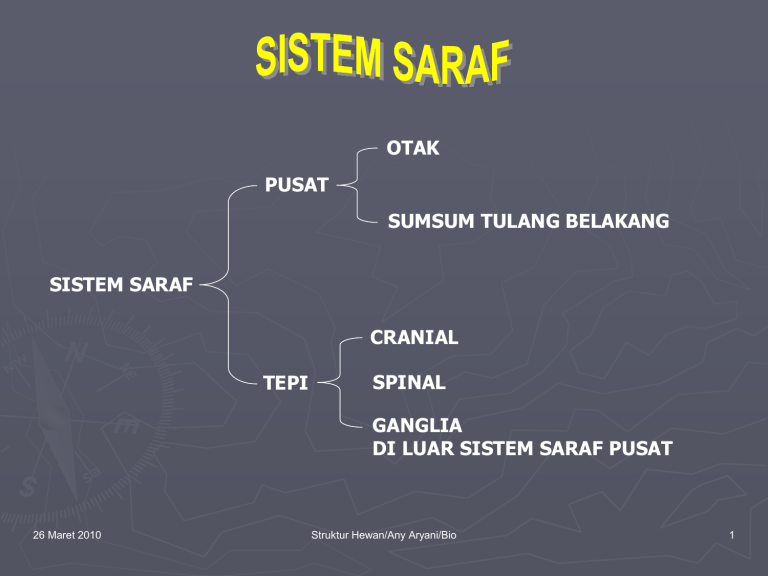 OTAK PUSAT SUMSUM TULANG BELAKANG SISTEM SARAF CRANIAL TEPI SPINAL GANGLIA DI LUAR SISTEM SARAF PUSAT 26 Maret 2010 Struktur Hewan/Any Aryani/Bio 1 26 Maret 2010 Struktur Hewan/Any Aryani/Bio 2 26 Maret 2010 Struktur Hewan/Any Aryani/Bio 9 26 Maret 2010 Struktur Hewan/Any Aryani/Bio 10 26 Maret 2010 Struktur Hewan/Any Aryani/Bio 11 26 Maret 2010 Struktur Hewan/Any Aryani/Bio 12 26 Maret 2010 Struktur Hewan/Any Aryani/Bio 13 26 Maret 2010 Struktur Hewan/Any Aryani/Bio 14 26 Maret 2010 Struktur Hewan/Any Aryani/Bio 15 26 Maret 2010 Struktur Hewan/Any Aryani/Bio 16 26 Maret 2010 Struktur Hewan/Any Aryani/Bio 17 26 Maret 2010 Struktur Hewan/Any Aryani/Bio 18 26 Maret 2010 Struktur Hewan/Any Aryani/Bio 19 26 Maret 2010 Struktur Hewan/Any Aryani/Bio 20 26 Maret 2010 Struktur Hewan/Any Aryani/Bio 21 HUBUNGAN ANTAR SEL SARAF 26 Maret 2010 Struktur Hewan/Any Aryani/Bio 22 Contoh Lengkung Refleks 26 Maret 2010 Struktur Hewan/Any Aryani/Bio 23 LENGKUNG REFLEK MONOSINAPTIK DAN POLISINAPTIK 26 Maret 2010 Struktur Hewan/Any Aryani/Bio 24 Lengkung Refleks Polisinaptik 26 Maret 2010 Struktur Hewan/Any Aryani/Bio 25 26 Maret 2010 Struktur Hewan/Any Aryani/Bio 26 26 Maret 2010 Struktur Hewan/Any Aryani/Bio 27 26 Maret 2010 Struktur Hewan/Any Aryani/Bio 28 26 Maret 2010 Struktur Hewan/Any Aryani/Bio 29 26 Maret 2010 Struktur Hewan/Any Aryani/Bio 30 26 Maret 2010 Struktur Hewan/Any Aryani/Bio 31 26 Maret 2010 Struktur Hewan/Any Aryani/Bio 32 26 Maret 2010 Struktur Hewan/Any Aryani/Bio 33 26 Maret 2010 Struktur Hewan/Any Aryani/Bio 34 26 Maret 2010 Struktur Hewan/Any Aryani/Bio 35 26 Maret 2010 Struktur Hewan/Any Aryani/Bio 36 26 Maret 2010 Struktur Hewan/Any Aryani/Bio 37 MENINGES CEREBRUM THALAMUS HYPOTHALAMUS Durameter Arachnoid Piameter HYPOPHISIS/PITUITARI PONS VAROLLI MEDULLA OBLONGATA CEREBELLUM MED 26 Maret 2010 Struktur Hewan/Any Aryani/Bio 38 26 Maret 2010 Struktur Hewan/Any Aryani/Bio 39 26 Maret 2010 Struktur Hewan/Any Aryani/Bio 40 26 Maret 2010 Struktur Hewan/Any Aryani/Bio 41 26 Maret 2010 Struktur Hewan/Any Aryani/Bio 42 26 Maret 2010 Struktur Hewan/Any Aryani/Bio 43 26 Maret 2010 Struktur Hewan/Any Aryani/Bio 44 26 Maret 2010 Struktur Hewan/Any Aryani/Bio 45 SPINAL CORD White matter Central canal Gray matter 26 Maret 2010 Struktur Hewan/Any Aryani/Bio 46 26 Maret 2010 Struktur Hewan/Any Aryani/Bio 47 26 Maret 2010 Cerebrum Struktur Hewan/Any Aryani/Bio 48 Molecular layer GM WM Cerebellum 26 Maret 2010 Struktur Hewan/Any Aryani/Bio 49 Cerebellum 26 Maret 2010 Foliae (F) and Nerve Fibers (NF) Struktur Hewan/Any Aryani/Bio 50 26 Maret 2010 Struktur Hewan/Any Aryani/Bio 51 26 Maret 2010 Struktur Hewan/Any Aryani/Bio 52 26 Maret 2010 Struktur Hewan/Any Aryani/Bio 53