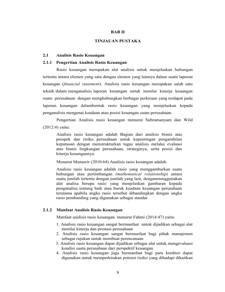 BAB II TINJAUAN PUSTAKA 2.1 Analisis Rasio Keuangan 2.1.1 Pengertian Analisis Rasio Keuangan Rasio keuangan merupakan alat analisis untuk menjelaskan hubungan tertentu antara elemen yang satu dengan elemen yang lainnya dalam suatu laporan keuangan (financial statement). Analisis rasio keuangan merupakan salah satu teknik dalam menganalisis laporan keuangan untuk menilai kinerja keuangan suatu perusahaan dengan menghubungkan berbagai perkiraan yang terdapat pada laporan keuangan dalambentuk rasio keuangan yang menjelaskan kepada penganalisis mengenai keadaan atau posisi keuangan suatu perusahaan. Pengertian Analisis rasio keuangan menurut Subramanyam dan Wild (2012:4) yaitu: Analisis rasio keuangan adalah Bagian dari analisis bisnis atas prospek dan risiko perusahaan untuk kepentingan pengambilan keputusan dengan menstrukturkan tugas analisis melalui evaluasi atas bisnis lingkungan perusahaan, strateginya, serta posisi dan kinerja keuangannya. Menurut Munawir (2010:64) Analisis rasio keuangan adalah: Analisis rasio keuangan adalah rasio yang menggambarkan suatu hubungan atau pertimbangan (mathematical relationship) antara suatu jumlah tertentu dengan jumlah yang lain, denganmenggunakan alat analisa berupa rasio yang menjelaskan gambaran kepada penganalisa tentang baik atau buruk keadaan keuangan perusahaan terutama apabila angka rasio tersebut dibandingkan dengan angka rasio pembanding yang digunakan sebagai standar. 2.1.2 Manfaat Analisis Rasio Keuangan Manfaat analisis rasio keuangan menurut Fahmi (2014:47) yaitu: 1. Analisis rasio keuangan sangat bermanfaat untuk dijadikan sebagai alat menilai kinerja dan prestasi perusahaan 2. Analisis rasio keuangan sangat bermanfaat bagi pihak manajemen sebagai rujukan untuk membuat perencanaan 3. Analisis rasio keuangan dapat dijadikan sebagai alat untuk mengevaluasi kondisi suatu perusahaan dari perspektif keuangan 4. Analisis rasio keuangan juga bermanfaat bagi para kreditor dapat digunakan untuk memperkirakan potensi risiko yang dihadapi dikaitkan 9 10 dengan adanya jaminan kelangsungan pembayaran bunga dan pengembalian pokok pinjaman 5. Analisis rasio keuangan dapat dijadikan sebagai penilaian bagi pihak stakeholder organisasi. 2.1.3 Teknik Analisis Rasio Keuangan Menurut Farah Margaretha dalam Fahmi (2014:50), penganalisaan rasio keuangan ada beberapa cara diantaranya: 1. Analisis horizontal (trend analysis), yaitu membandingkan rasio-rasio keuangan perusahaan dari tahun-tahun yang lalu dengan tujuan agar dapat dilihat trend dari rasio-rasio perusahaan selama kurun waktu tertentu. 2. Analisis vertikal, yaitu membandingkan data rasio keuangan perusahaan dengan rasio semacam dari perusahaan lain yang sejenis atau industri untuk waktu yang sama. 2.1.4 Keterbatasan Analisis Rasio Keuangan Menurut Harahap (2010:298), keterbatasan analisis rasio keuangan adalah: 1. Kesulitan dalam memilih rasio yang tepat yang dapat digunakan untuk kepentingan pemakainya. 2. Keterbatasan yang dimiliki akuntansi atau laporan keuangan juga menjadi keterbatasan teknik ini seperti: a. Bahan perhitungan rasio atau laporan keuangan itu banyak mengandung taksiran dan judgment yang dapat dinilai bias atau subjektif b. Nilai yang terkandung dalam laporan keuangan dan rasio adalah nilai perolehan (cost) bukan harga pasar c. Klasifikasi dalam laporan keuangan bisa berdampak pada angka rasio d. Metode pencatatan yang tergambar dalam standar akuntansi bisa diterapkan berbeda oleh perusahaan yang berbeda 3. Jika data untuk menghitung rasio tidak bersedia, akan menimbulkan kesulitan menghitung rasio 4. Sulit Jika data yang tersedia tidak singkron 5. Dua perusahaan dibandingkan bisa saja teknik dan standar akuntansi yang dipakai tidak sama.Oleh karenanya jika dilakukan perbandingan bisa menimbulkan kesalahan. 2.1.5 Jenis-Jenis Analisis Rasio Keuangan Menurut Munawir (2010:239) terdapat empatkelompok rasio keuangan yaitu: 1. Rasio Likuiditas Yaitu rasio untuk mengetahui kemampuan perusahaan membiayai operasi dan memenuhi kewajiban finansial pada saat ditagih. 11 2. Rasio Leverage Yaitu rasio untuk mengukur seberapa jauh aktiva perusahaan dibiayai oleh hutang. 3. Rasio Aktivitas Yaitu rasio untuk mengetahui kemampuan perusahaan dalam melaksanakan aktivitas sehari-hari atau kemampuan perusahaan dalam penjualan, penagihan piutang maupun pemanfaatan aktiva yang dimiliki. 4. Rasio Rentabilitas Yaitu rasio yang digunakan untuk menilai kemampuan perusahaan untuk memperoleh keuntungan. Menurut Harahap (2010:101) rasio keuangan yang sering digunakan adalah sebagai berikut: 1. Rasio likuiditas adalah rasio yang menggambarkan kemampuan perusahaan untuk menyelesaikan kewajiban jangka pendeknya. 2. Rasio solvabilitas adalah adalah rasio yang menggambarkan kemampuan perusahaan dalam membayar kewajiban jangka panjangnya atau kewajiban-kewajibannya apabila perusahaan dilikuidasi. 3. Rasio rentabiltas/profitabilitas adalah rasio yang menggambarkan kemampuan perusahaan menghasilkan laba. 4. Rasio leverage adalah adalah rasio yang melihat seberapa jauh perusahaan dibiayai oleh hutang atau pihak luar. 5. Rasio aktivitas adalah rasio yang menggambarkan aktivitas yang dilakukan perusahaan dalam menjalankan operasinya. 6. Rasio pertumbuhan adalah rasio yang menggambarkan persentase kenaikkan penjualan/pendapatan tahun ini dibanding dengan tahun lalu. 7. Penilaian pasar adalah rasio yang menggambarkan situasi atau keadaan prestasi perusahaan dipasar modal. 8. Rasio produktivitas adalah rasio yang menunjukkan tingkat produktivitas dari unit atau kegiatan yang dinilai. Sedangkan menurut Kasmir (2014:106) bentuk-bentuk rasio keuangan adalah sebagai berikut: 1. Rasio likuiditas (Liquidity Ratio) a. Rasio Lancar (Current Ratio) b. Rasio Sangat Lancar (Quick Ratio atau Acid Test Ratio) 2. Rasio Solvabilitas (Leverage Ratio) a. Total utang dibandingkan dengan total aktiva atau rasio utang (DebtRatio) b. Jumlah kali perolehan bunga (Times Interest Earned) c. Lingkup biaya tetap (Fixed Charge Coverage) d. Lingkup a