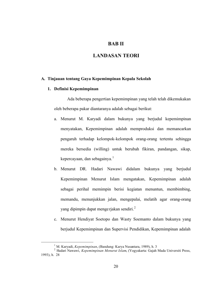 BAB II LANDASAN TEORI A. Tinjauan tentang Gaya Kepemimpinan Kepala Sekolah 1. Definisi Kepemimpinan Ada beberapa pengertian kepemimpinan yang telah telah dikemukakan oleh beberapa pakar diantaranya adalah sebagai berikut: a. Menurut M. Karyadi dalam bukunya yang berjudul kepemimpinan menyatakan, Kepemimpinan adalah memproduksi dan memancarkan pengaruh terhadap kelompok-kelompok orang-orang tertentu sehingga mereka bersedia (willing) untuk berubah fikiran, pandangan, sikap, kepercayaan, dan sebagainya. 1 b. Menurut DR. Hadari Nawawi didalam bukunya yang berjudul Kepemimpinan Menurut Islam mengatakan, Kepemimpinan adalah sebagai perihal memimpin berisi kegiatan menuntun, membimbing, memandu, menunjukkan jalan, mengepalai, melatih agar orang-orang yang dipimpin dapat menge rjakan sendiri. 2 c. Menurut Hendiyat Soetopo dan Wasty Soemanto dalam bukunya yang berjudul Kepemimpinan dan Supervisi Pendidikan, Kepemimpinan adalah 1 M. Karyadi, Kepemimpinan, (Bandung: Karya Nusantara, 1989), h. 3 Hadari Nawawi, Kepemimpinan Menurut Islam, (Yogyakarta: Gajah Mada Universiti Press, 1993), h. 28 2 20 21 suatu kegiatan dalam membimbing suatu kelompok sedemikian hingga/rupa sehingga tercapai tujuan dari kelompok itu yaitu tujuan bersama. 3 d. Menurut Wahdjosumidjo dalam bukunya yang berjudul Kepemimpinan dan Motivasi, Kepemimpinan adalah: 4 1) Sesuatu yang melekat pada diri seorang pemimpin yang berupa sifatsifat tertentu seperti: Kepribadian (personality), Kemampuan (ability), dan Kesanggupan (capability). 2) Kepemimpinan adalah serangkaian kegiatan (activity) pemimpin yang tidak dapat dipisahkan dengan kedudukan (posisi) serta gaya atau perilaku pemimpin itu sendiri. 3) Kepemimpinan adalah sebagai proses antar hubungan antar interaksi antara pemimpin, bawahan dan situasi. Dari berbagai pakar tersebut diatas, dapat diambil kesimpulan bahwa Kepemimpinan adalah sebuah proses kegiatan mempengaruhi, mengorganisasi, menggerakkan, mengarahkan, membimbing, mengajak orang lain untuk melaksanakan sesuatu dalam rangka mencapai tujuan bersama yang ditetapkan mencakup: a. Keterlibatan orang lain atau kelompok orang dalam mencapai tujuan. 3 Hendiyat Soetopo dan Wasti Soemanto, Kepemimpinan dan Supervisi Pendidikan, (Jakarta: Bina Aksara, 1988), h. 1 4 Wahjosumidjo, Kepemimpinan dan Motivasi, (Jakarta: Ghalia Indonesia, 1987), h. 26 22 b. Adanya faktor tertentu yang ada pada pemimpin sehingga orang lain bersedia digerakkan atau dipengaruhi. c. Adanya usaha untuk mengarahkan dan mempengaruhi perilaku orang lain, Dalam hal ini guru, karyawan, wali murid, masyarakat disekitar sekolah untuk mencapai tujuan yang telah ditetapkan bersama. 2. Definisi Gaya Kepemimpinan Gaya kepemimpinan adalah cara atau teknik seseorang dalam menjalankan suatu kepemimpinan. 5 Dengan berusaha mempengaruhi perilaku orang-orang yang dikelolanya. 6 Sedangkan Menurut Mulyasa dalam bukunya yang berjudul Menjadi Kepala Sekolah Profesional bahwa gaya kepemimpinan berpengaruh terhadap kinerja pegawai untuk meningkatkan produktivitas kerja demi mencapai tujuan Dalam kaitannya dengan peranan gaya kepemimpinannya dalam meningkatkan kinerja pegawai. Perlu dipahami bahwa setiap pemimpin bertanggung jawab mengarahkan apa yang baik bagi pegawainya. Sebagai pemimpin harus memiliki kemampuan diantaranya yang berkaitan dengan: 1). Pembinaan disiplin, 2). Pembangkitan Motivasi, 3). Penghargaan. Ada bebrapa macam istilah yang digunakan untuk menerangkan pendekatan umum yang dipergunakan oleh para pemimpin dalam situasi 5 M. Ngalim Purwanto, Administrasi dan Supervisi Pendidikan, (Bandung: Remaja Rosda Karya, 2006), h. 48 6 Agus Darma, Managemen Supervisi, Petunjuk Praktis Bagi Para Supervisor, (Jakarta: Raja Grafindo Persada, 2004), h. 144 23 kemanusiaan antara lain: Demokratis, birokratis, neurokratis, otokratis dan laissez faire. Gaya kepemimpinan sederhana dalam Purwanto mengatakan bahwa gaya kepemimpinan dibedakan menjadi tiga macam meliputi, 1). Otokrasi, 2) Demokrasi, dan 3). Laissez Faire. 7 Adapun ciri-ciri gaya kepemimpinan otokrasi, demokrasi, dan laissez faire, antara lain: a. Kepemimpinan yang Otokrasi. Dalam kepemimpinan yang otokrasi, pemimpin bertindak sebagai diktator terhadap anggota-anggota kelompoknya. Kekuasaan pemimpin otokrasi hanya dibatasi oleh undang-undang. Penafsirannya sebagai pemimpin otokrasi tidak lain adalah menunjukkan dan memberi perintah, tidak ada koordinasi dengan para bawahan diartikan sebagai kepicikan, pembangkangan, atau pelanggaran disiplin terhadap perintah atau instruksi yang telah ditetapkan. Kekuasaan yang berlebihan ini dapat menimbulkan sikap menyerah tanpa kritik “Asal Bapak Senang” terhadap pemimpin dan kecenderungan untuk mengabdikan perintah dan tugas tidak ada pengawasan langsung. Dominasi yang berlebihan mudah menghidupkan oposisi terhadap kepemimpinan, atau menimbulkan sifat apatis, atau sifat agresif pada anggota-anggota kelompok terhadap pemimpinnya. 7 M. Ngalim Purwanto, Administrasi dan Supervisi Pendidikan, (Bandung: Remaja Rosdakarya, 2006), h. 48-52 24 Menurut Hendiyat Soetopo dalam bukunya Kepemimpinan dan Supervisi Pendidikan bahwa kepemimpinan yang otokrasi yaitu pemimpin lebih bersifat ingin berkuasa, suasana disekolah tegang. Pemimpin sama sekali tidak memberi kebebasan kepada anggota kelompok untuk turut ambil bagian dalam memutus suatu persoalan. 8 Sedangkan menurut Ngalim Purwanto kepemimpinan Otokrasi atau otoriter meliputi: 1). Menganggap organisasi yang dipimpinnya sebagai milik pribadi, 2). Mengidentifikasikan tujuan pribadi dengan tujuan organisasi, 3). Menganggap bawahan sebagai alat semata- mata, 4). Tidak mau menerima pendapat, saran, dan kritik dari anggotanya, 5). Terlalu bergantung pada kekuasaan formalnya, 6). Cara menggerakkan bawahan dengan pendekatan paksaan dan bersifat mencari kesalahan atau menghukum. 9 Disini pemimpin dalam hal ini kepala sekolah mendikte kepada anggota yang ada dibawah kepemimpinanya, gaya mendikte dapat digunakan ketika para tenaga kependidikan berada