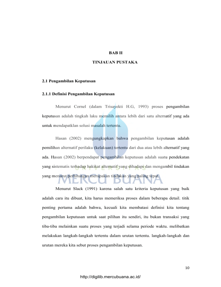 BAB II TINJAUAN PUSTAKA 2.1 Pengambilan Keputusan 2.1.1 Definisi Pengambilan Keputusan Menurut Cornel (dalam Trisayekti H.G, 1993) proses pengambilan keputusan adalah tingkah laku memilih antara lebih dari satu alternatif yang ada untuk mendapatklan solusi masalah tertentu. Hasan (2002) mengungkapkan bahwa pengambilan keputusan adalah pemilihan alternatif perilaku (kelakuan) tertentu dari dua atau lebih alternatif yang ada. Hasan (2002) berpendapat pengambilan keputusan adalah suatu pendekatan yang sistematis terhadap hakikat alternatif yang dihadapi dan mengambil tindakan yang menurut perhitungan merupakan tindakan yang paling tepat. Menurut Slack (1991) karena salah satu kriteria keputusan yang baik adalah cara itu dibuat, kita harus memeriksa proses dalam beberapa detail. titik penting pertama adalah bahwa, kecuali kita membatasi definisi kita tentang pengambilan keputusan untuk saat pilihan itu sendiri, itu bukan transaksi yang tiba-tiba melainkan suatu proses yang terjadi selama periode waktu. melibatkan melakukan langkah-langkah tertentu dalam urutan tertentu. langkah-langkah dan urutan mereka kita sebut proses pengambilan keputusan. 10 http://digilib.mercubuana.ac.id/ Dari definisi yang telah diungkapkan oleh para ahli diatas, maka peneliti dapat mengambil kesimpulan bahwa pengambilan keputusan adalah suatu proses pemilihan alternatif terbaik dari beberapa alternatif yang ada sebagai cara pemecahan masalah pada setiap individu dalam hidupnya. 2.2.2 Fungsi dan Tujuan Pengambilan Keputusan 1.) Fungsi Pengambilan Keputusan Menurut Hasan (2002) Pengambilan keeputusan sebagai suatu kelanjutan cara pemecahan masalah memiliki fungsi antara lain sebagai berikut : a.) Pangkal permulaan dari semua aktifitas manusia yang sadar dan terarah baik secara individual maupun secara kelompok, baik secara institusional maupun secara organisasional. b.) Sesuatu yang bersifat futuristik, artinya bersangkut paut dengan hari depan, masa yang akan datang, dimana efeknya atau pengaruhnya berlangsung cukup lama. 2.) Tujuan Pengambilan Keputusan Hasan (2002) mengemukakan bahwa tujuan pengambilan keputusan dapat dibedakan atas dua, yaitu sebagai berikut : 11 http://digilib.mercubuana.ac.id/ a.) Tujuan yang bersifat tunggal Tujuan pengambilan keputusan yang bersifat tunggal terjadi apabila keputusan yang dihasilkan hanya menyangkut satu masalah, artinya bahwa sekali diputuskan, tidak akan ada kaitannya dengan masalah lain. b.) Tujuan yang bersifat ganda Tujuan pengambilan keputusan yang bersifat ganda terjadi apabila keputusan yang dihasilkan itu menyangkut lebih dari satu masalah, artinya bahwa satu keputusan yang di ambil itu sekaligus memecahkan dua masalah (atau lebih) yang bersifat tidak kontradiktif. 2.2.3 Dasar-Dasar Pengambilan Keputusan Hasan (2002) menyebutkan dasar-dasar dari pengambilan keputusan yang berlaku adalah sebagai berikut : 1.) Intuisi Pengambilan keputusan yang berdasarkan atas intuisi atau perasaan memiliki sifat subyektif, sehingga mudah terkena pengaruh. Pengambilan keputusan berdasarkan intuisi ini mengandung beberapa kebaikan dan kelemahan. Kebaikannya antara lain sebagai berikut : a.) Waktu yang digunakan untuk mengambil keputusan relatif pendek 12 http://digilib.mercubuana.ac.id/ b.) Kemampuan mengambil keputusan dari pihak mengambil keputusan itu sangat berperan, dan itu perlu dimanfaatkan dengan baik. Kelemahannya antara lain sebagai berikut : a.) Keputusan yang dihasilkan relatif kurang baik b.) Dasar-dasar lain dalam pengambilan keputusan sering kali diabaikan 2.) Pengalaman Pengambilan keputusan berdasarkan pengalaman memiliki manfaat bagi pengetahuan praktis. Karena pengalaman seseorang dapat memperkirakan keadaan sesuatu, dapat memperhitungkan untung ruginya, baik buruknya keputusan yang akan dihasilkan. Karena pengalaman, seseorang yang menduga masalahnya walaupun hanya dengan melihat sepintas saja mungkin sudah dapat menduga cara penyelesaiannya. 3.) Fakta Pengambilan keputusan berdasarkan fakta dapat memberikan keputusan yang sehat, solid, dan baik. Dengan fakta, maka tingkat kepercayaan terhadap pengambilan keputusan dapat lebih tinggi, sehingga orang dapat menerima keputusan-keputusan yang dibuat itu dengan rela dan lapang dada. 13 http://digilib.mercubuana.ac.id/ 4.) Wewenang Pengambilan keputusan berdasarkan wewenang biasanya dilakukan oleh pimpinan terhadap bawahannya atau orang yang lebih tinggi kedudukannya kepada orang yang lebih rendah kedudukannya. 5.) Rasional Pada pengambilan keputusan yang berdasarkan rasional, keputusan yang dihasilkan bersifat obyektif, logis, lebih transparan, konsisten untuk memaksimalkan hasil atau nilai dalam batas kendala tertentu, sehingga dapat dikatakan mendekati kebenaran atau sesuai dengan apa yang diinginkan. 2.2.4 Faktor-faktor yang mempengaruhi pengambilan keputusan Pada penelitian Dietrich, C. (2010) mengatakan bahwa ada beberapa faktor yang mempengaruhi pengambilan keputusan. Faktor-faktor ini, termasuk pengalaman masa lalu (Juliusson, Karlsson, &Garling, 2005), bias kognitif (Stanovich & Barat, 2008), usia dan perbedaan individu (Bruin, Parker, & Fischoff, 2007), kepercayaan pada relevansi pribadi ( Acevedo, & Krueger, 2004), dan eskalasi komitmen, mempengaruhi orang dalam membuat pilihan. 14 http://digilib.mercubuana.ac.id/ 2.2.4 Tahapan dalam pengambilan keputusan Tahap-tahap pengambilan keputusan yang dikemukakan oleh Janis dan Mann (dalam Karlina, 2004) yaitu : a. Menilai masalah. Masalah dapat dikatakan sebagai konflik yang terjadi pada situasi riil dengan situasi lain yang dijadikan tujuan oleh individu. Dengan kata lain masalah dapat diidentifikasi oleh individu saat ia menyadari adanya kesenjangan antara situasi yang riil dengan yang diharapkan. Masalah menuntut individu untuk mengambil tindakan baru. Pemahaman akan masalah dapat membuat individu melihat masalah dengan kemungkinan risiko-risiko yang dapat terjadi. b. Mencari Alternatif. Setelah mendapat pemahaman yang baik mengenai masalah yang dihadapi, individu bi