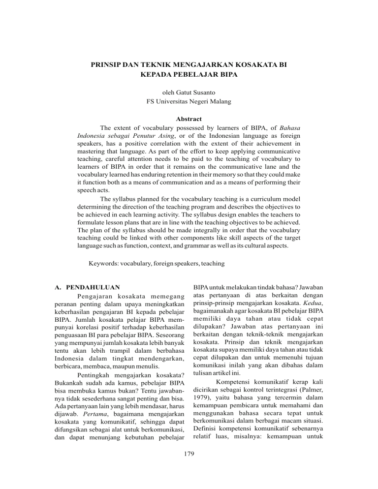PRINSIP DAN TEKNIK MENGAJARKAN KOSAKATA BI KEPADA PEBELAJAR BIPA oleh Gatut Susanto FS Universitas Negeri Malang Abstract The extent of vocabulary possessed by learners of BIPA, of Bahasa Indonesia sebagai Penutur Asing, or of the Indonesian language as foreign speakers, has a positive correlation with the extent of their achievement in mastering that language. As part of the effort to keep applying communicative teaching, careful attention needs to be paid to the teaching of vocabulary to learners of BIPA in order that it remains on the communicative lane and the vocabulary learned has enduring retention in their memory so that they could make it function both as a means of communication and as a means of performing their speech acts. The syllabus planned for the vocabulary teaching is a curriculum model determining the direction of the teaching program and describes the objectives to be achieved in each learning activity. The syllabus design enables the teachers to formulate lesson plans that are in line with the teaching objectives to be achieved. The plan of the syllabus should be made integrally in order that the vocabulary teaching could be linked with other components like skill aspects of the target language such as function, context, and grammar as well as its cultural aspects. Keywords: vocabulary, foreign speakers, teaching A. PENDAHULUAN Pengajaran kosakata memegang peranan penting dalam upaya meningkatkan keberhasilan pengajaran BI kepada pebelajar BIPA. Jumlah kosakata pelajar BIPA mempunyai korelasi positif terhadap keberhasilan penguasaan BI para pebelajar BIPA. Seseorang yang mempunyai jumlah kosakata lebih banyak tentu akan lebih trampil dalam berbahasa Indonesia dalam tingkat mendengarkan, berbicara, membaca, maupun menulis. Pentingkah mengajarkan kosakata? Bukankah sudah ada kamus, pebelajar BIPA bisa membuka kamus bukan? Tentu jawabannya tidak sesederhana sangat penting dan bisa. Ada pertanyaan lain yang lebih mendasar, harus dijawab. Pertama, bagaimana mengajarkan kosakata yang komunikatif, sehingga dapat difungsikan sebagai alat untuk berkomunikasi, dan dapat menunjang kebutuhan pebelajar BIPA untuk melakukan tindak bahasa? Jawaban atas pertanyaan di atas berkaitan dengan prinsip-prinsip mengajarkan kosakata. Kedua, bagaimanakah agar kosakata BI pebelajar BIPA memiliki daya tahan atau tidak cepat dilupakan? Jawaban atas pertanyaan ini berkaitan dengan teknik-teknik mengajarkan kosakata. Prinsip dan teknik mengajarkan kosakata supaya memiliki daya tahan atau tidak cepat dilupakan dan untuk memenuhi tujuan komunikasi inilah yang akan dibahas dalam tulisan artikel ini. Kompetensi komunikatif kerap kali dicirikan sebagai kontrol terintegrasi (Palmer, 1979), yaitu bahasa yang tercermin dalam kemampuan pembicara untuk memahami dan menggunakan bahasa secara tepat untuk berkomunikasi dalam berbagai macam situasi. Definisi kompetensi komunikatif sebenarnya relatif luas, misalnya: kemampuan untuk 179 180 menyesuaikan totalitas sumber komunikasi seseorang, yakni linguistik dan fungsional (ektra linguistik atau para linguistik). Pada referensi lain (Weiman dan Blacklaund, 1980) para linguis terapan (Canale dan Swin, 1980) mendefinisikan konsep kompetensi komunikatif dengan menunjukkan multiplisit komponen-komponen yang memungkinkan. Tampaklah bahwa setidaknya ada tiga tradisi inkuiri berbeda yang muncul dalam tradisi komunikatif: (1) psikolog dan spesialis komunikasi memandang kompetensi komunikatif pada dasarnya sebagai kemampuan untuk memahami, mengorganisir, dan menyampaikan informasi, misalnya: Flavell, Botkin, Fry, Wright dan Jarvis (1968); (2) para filsof bahasa seperti Austin dan Sherle (1969) menggunakan pendekatan pendekatan kompetensi komunikatif sebagai kemampuan untuk menjalankan tindakan-tindakan berbicara secara ifesien; dan (3) sosiolinguis yang kerap kali dipengaruhi filsuf-filsuf bahasa, mendefinisikan kompetensi komunikatif dalam terma-terma ketepatan penggunaan bahasa dalam situasi khusus (Hymes, 1971, Shuy, 1979). Kecakapan komunikatif dapat dicirikan dalam terma berbagai macam sistem dan ketrampilan. Karangka Canale (1984) mencakup empat area, antara lain: 1) Kompetensi tatabahasa: penggunaan kode bahasa yang berkaitan dengan fitur-fitur seperti butir-butir leksikal, aturan-aturan pembentukan kalimat, pelafalan, dan pemaknaan literal. 2) Kompetensi kewacanaan; menekankan pada ketepatan bentuk dan makna untuk mencapai teks terucap dan tertulis dalam gaya yang berbeda dengan menggunakan (a) peralatan kohesi untuk mengaitkan bentuk-bentuk ucapan (misalnya, kata ganti, kata transisi, dan struktur parallel), dan (b) aturan-aturan koherensi untuk mengatur makna (misalnya, pengulangan, pemajemukan, konsistensi, dan relevansi ide). 3) Kompetensi sosiolinguistik: penggunaan secara tepat dalam konteks sosial berbeda, dengan penekanan pada ketepatan makna (misalnya, sikap, tindakan berbicara, dan proposisi) dan penguasaan bentuk-bentuk yang sopan (register, ekspresi nonverbal, dan intonasi). 4) Kompetensi strategis: penguasaan strategistrategi verbal dan nonverbal (a) untuk mengkompensasi kerusakan dalam komunikasi akibat adanya kompetensi yang tidak cukup atau limitasi performa (misalnya, strategi penggunaan kamus, parafrase, dan gerak insyarat), dan (b) untuk efektivitas komunikasi (misalnya, berbicara lambat dan lemah dalam efek retorika). Kerangka lain yang menggambarkan kompetensi kompetensi komunikatif dikemukakan oleh Faerch dan rekan-rekanya (1984). Mereka berargumen bahwa kompetensi komunikatif terdiri dari fonologi/ortograsi, kosakata, tata bahasa, pragmatik, wacana, strategi komunikasi, dan kefasihan. Model Bachman (1990), kompetensi bahasa mencakup dua komponen utama, yakini: (a) kompetensi organisasional, terdiri atas kompetensi tata bahasa, dan (b) kompetensi tekstual yang mencakup berbagai macam sub ketrampilan bahasa. Kompetensi pragmatis mencakup penggunaan bahasa secara fungsional. Kompetensi strategis adalah serangkaian kemampuan umum yang mengguna