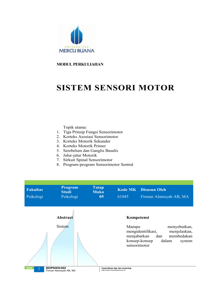 MODUL PERKULIAHAN SISTEM SENSORI MOTOR 1. 2. 3. 4. 5. 6. 7. 8. Fakultas Psikologi 2014 7 Topik utama: Tiga Prinsip Fungsi Sensorimotor Korteks Asosiasi Sensorimotor Korteks Motorik Sekunder Korteks Motorik Primer Serebelum dan Ganglis Basalis Jalur-jalur Motorik Sirkuit Spinal Sensorimotor Program-program Sensorimotor Sentral Program Studi Psikologi Tatap Muka 05 Kode MK Disusun Oleh 61045 Firman Alamsyah AB, MA Abstract Kompetensi Sistem Mampu menyebutkan, mengidentifikasi, menjelaskan, menjabarkan dan membedakan konsep-konsep dalam system sensorimotor BIOPSIKOLOGI Firman Alamsyah AB, MA Pusat Bahan Ajar dan eLearning http://www.mercubuana.ac.id A. TIGA PRINSIP FUNGSI SENSORIMOTOR Terdapat tiga prinsip fungsi sensorimotor yaitu: 1. System sensorimotor terorganisasi secara hierarkis. Keunggulan organisasi hierarkis ini adalah tingkat-tingkat yang lebih tinggi dalam hierarki dibiarkan bebas melakukan fungsi-fungsi yang lebih kompleks. Sistem sensorimotor adalah sistem hierarki yang bersifat paralel dan terorganisasi secara fungsional. Perbedaan utama antara sistem sensori dan sistem sensorimotor adalah arah aliran informasi primernya. Dalam sistem sensori informasi terutama mengalir naik melalui hierarki, sedangkan dalam sistem sensorimotor, informasi terutama mengalir turun. 2. Output motorik dipandu oleh input sensori Sistem sensorimotor yang meliputi mata, organ-organ keseimbangan dan reseptor-reseptor di kulit, otot, dan persendian semuanya memantau responrespon tubuh dan mereka mengumpanbalikkan informasi itu ke dalam sirkuitsirkuit sensorimotor. Pada kebanyakan kasus, sensory feedback (arus balik sensori) berperan penting dalam mengarahkan kesinambungan berbagai respon yang dihasilkannya. Satu-satunya respon yang biasanya tidak dipengaruhi oleh umpan balik sensori adalah ballistic movements (gerakan balistik) yaitu gerakangerakan pendek, all-or-none, dan berkecepatan tinggi. Banyak penyesuaian dalam output motorik yang terjadi sebagai respon terhadap umpan balik sensorik yang dikontrol secara tak sadar oleh tingkat hierarki sensorimotor yang lebih rendah tanpa keterlibatan tingkat-tingkat yang lebih tinggi. 3. Belajar mengubah sifat dan lokus control sensorimotor Terjadi perubahan dalam proses belajar sensorimotor. Selama tahap-tahap awal belajar motorik, setiap respon individual dikerjakan di bawah kontrol yang disadari, kemudian setelah banyak latihan, respon-respon individual menjadi terorganisasi menjadi sekuensi-sekuensi tindakan yang terintegrasi secara berkesinambungan yang mengalir lancar dan disesuaikan oleh umpan balik sensori tanpa regulasi sadar. 2014 5 Biopsikologi Firman alamsyah AB, MA Pusat Bahan Ajar dan eLearning http://www.mercubuana.ac.id Model umum fungsi system sensorimotor, digambarkan sebagai berikut: Gambar, ilustrasi beberapa prinsip organisasi system sensorimotor. B. Korteks Asosiasi Sensorimotor Korteks asosiasi berada di puncak hierarki sensorimotor. Terdapat dua daerah korteks asosiasi sensorimotor utama yaitu: 1. Korteks asosiasi parietal posterior Sebelum sebuah gerakan efektif dapat diawali informasi tertentu dibutuhkan. Sistem saraf harus tahu posisi awal bagian-bagian tubuh yang akan digerakkan dan ia juga harus tahu posisi objek eksternal dengan siapa tubuh akan berinteraksi. Korteks asosiasi parietal posterior (porsi neokorteks parietal yang letaknya posterior terhadap korteks somatosensori primer) berperan penting dalam mengintegrasikan kedua macam informasi ini dan dalam mengarahkan perhatian. Pada gilirannya, banyak output korteks parietal posterior pergi ke daerah-daerah korteks motorik, yang berlokasi di kortesk frontal, ke korteks asosiasi prefrontal dorsolateral ke berbagai daerah korteks motorik sekunder dan ke medan mata frontal (sebuah daerah kecil korteks prefrontal yang mengontrol gerakan-gerakan mata. Kerusakan pada korteks parietal posterior dapat mengakibatkan yang paling utama adalah: 2014 5 Biopsikologi Firman alamsyah AB, MA Pusat Bahan Ajar dan eLearning http://www.mercubuana.ac.id a) Apraxia (apraksia), gangguan gerakan disengaja yang tidak dapat diatribusikan pada sebuah defisit motorik sederhana atau pada defisit apapun dalam komprehensi atau motivasi. b) Contralateral neglect, gangguan pada kemampuan pasien untuk merespon stimuli pada satu sisi tubuh yang berlawanan (kontralateral) dengan sisi lesi otak, tanpa disertai adanya defisit sensorik atau defisit motorik sederhana. Gambar input kortikal utama dan jalur-jalur output korteks asosiasi parietal posterior 2. Korteks asosiasi prefrontal dorsolateral Daerah besar lain di korteks asosiasi yang memiliki fungsi sensorimotor penting adalah korteks asosiasi prefrontal dorsolateral yang menerima proyeksi-proyeksi dari korteks parietal posterior dan mengirimkan proyeksi-proyeksi ke daerahdaerah korteks motorik sekunder, ke korteks motorik primer dan ke medan mata frontal. Korteks prefrontal dorsolateral tampaknya berperan dalam evaluasi stimuli eksternal dan inisiasi reaksi-reaksi yang disengaja terhadapnya. Gambar input kortikal utama dan jalu-jalur output korteks asosiasi prefrontal dorsolateral 2014 5 Biopsikologi Firman alamsyah AB, MA Pusat Bahan Ajar dan eLearning http://www.mercubuana.ac.id C. Korteks Motorik Sekunder Daerah-daerah korteks motorik sekunder adalah daerah-daerah yang menerima banyak inputnya dari korteks asosiasi dan mengirimkan banyak outputnya ke korteks motorik primer. Selama bertahun-tahun, hanya ada dua daerah korteks motorik sekunder yang diketahui dan terlihat jelas di permukaan lateral lobus frontal, tepat pada posisi anterior terhadap korteks motorik primer, yaitu: 1. Daerah motorik suplementer Daerah tersebut menutupi bagian puncak lobus frontal dan memanjang, menuruni permukaan medialnya ke dalam fisura longitudinal 2. Korteks premotorik Yang mengalir ke dalam bentuk strip dari daerah motorik suplementer ke fisura lateral. Konsepsi dua daerah sederhana untuk korteks motorik sekunder itu telah menjadi lebih kompleks. Terdapat bukti bahwa paling ti