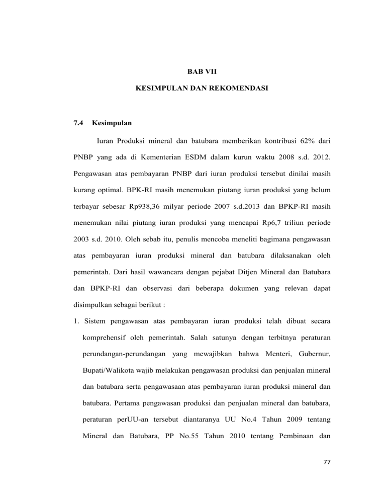 BAB VII KESIMPULAN DAN REKOMENDASI 7.4 Kesimpulan Iuran Produksi mineral dan batubara memberikan kontribusi 62% dari PNBP yang ada di Kementerian ESDM dalam kurun waktu 2008 s.d. 2012. Pengawasan atas pembayaran PNBP dari iuran produksi tersebut dinilai masih kurang optimal. BPK-RI masih menemukan piutang iuran produksi yang belum terbayar sebesar Rp938,36 milyar periode 2007 s.d.2013 dan BPKP-RI masih menemukan nilai piutang iuran produksi yang mencapai Rp6,7 triliun periode 2003 s.d. 2010. Oleh sebab itu, penulis mencoba meneliti bagimana pengawasan atas pembayaran iuran produksi mineral dan batubara dilaksanakan oleh pemerintah. Dari hasil wawancara dengan pejabat Ditjen Mineral dan Batubara dan BPKP-RI dan observasi dari beberapa dokumen yang relevan dapat disimpulkan sebagai berikut : 1. Sistem pengawasan atas pembayaran iuran produksi telah dibuat secara komprehensif oleh pemerintah. Salah satunya dengan terbitnya peraturan perundangan-perundangan yang mewajibkan bahwa Menteri, Gubernur, Bupati/Walikota wajib melakukan pengawasan produksi dan penjualan mineral dan batubara serta pengawasaan atas pembayaran iuran produksi mineral dan batubara. Pertama pengawasan produksi dan penjualan mineral dan batubara, peraturan perUU-an tersebut diantaranya UU No.4 Tahun 2009 tentang Mineral dan Batubara, PP No.55 Tahun 2010 tentang Pembinaan dan 77 Pengawasan Penyelenggaraan Pengelolaan Usaha Pertambangan Mineral dan Batubara, Permen ESDM no.17 Tahun 2010 tentang Tatacara Penetapan Harga Patokan Penjualan DAG/PER/5/2012 Mineral tentang dan Batubara, Ketentuan PerMenDag Ekspor Produk No. 29/M- Pertambangan, PerMenDag No. 39/M-DAG/PER/7/2014 tentang Ketentuan Ekspor Produk Batubara dan Produk Batubara, PerMenDag No. 44/M-DAG/PER/7/2014 tentang Ketentuan Ekspor Timah, Perdirjen Minerba No. 481 K/30/DJB/2014 tentang Tatacara Penetapan Surveyor untuk Verifikasi Analisa Kualitas Dan Kuantitas Penjualan Batubara. Kedua pengawasan pembayaran iuran produksi, peraturan perUU-an tersebut diantaranya UU No.4 Tahun 2009 tentang Mineral dan Batubara, PP No.55 Tahun 2010 tentang Pembinaan dan Pengawasan Penyelenggaraan Pengelolaan Usaha Pertambangan Mineral dan Batubara, PP No.22 Tahun 2005 tentang Pemeriksaan PNBP. 2. Kegiatan pengawasan pembayaran iuran produksi mineral dan batubara dimulai dari pengawasan produksi dan penjualan sampai dengan pengawasan pembayaran iuran produksi mineral dan batubara. a. Pertama, kegiatan pengawasan produksi dan penjualan telah dilakukan setiap bulan. Paramater yang digunakan dalam pelaksanaan pengawasan yaitu menentukan kesesuaian jumlah, kualitas dan harga mineral dan batubara berdasarkan laporan produksi dan penjualan yang disampaikan oleh perusahaan tambang dengan dokumen pendukung sebagaimana dijelaskan pada bab 5 serta berdasarkan hasil inspeksi atau pengamatan dilapangan. Untuk memudahkan dalam pelaksanaan pengawasan, 78 pemerintah menunjuk perusahaan surveyor untuk menguji jumlah dan kualitas mineral dan batubara yang hendak dijual. b. Kedua, pengawasan atas pembayaran iuran produksi mineral dan batubara dilakukan dengan dilakukan melalui rekonsiliasi untuk mencocokkan data pembayaran iuran produksi yang tercatat oleh Ditjen Mineral dan Batubara dengan Ditjen Perbendaharaan Kemenkeu serta verifikasi untuk mencocokkan laporan pembayaran iuran produksi mineral dan batubara dengan dokumen pendukung (laporan penjualan mineral dan batubara dan laporan surveyor). Kegiatan verifikasi juga dilakukan oleh tiga pihak diantaranya Perusahaan Surveyor, Ditjen Mineral dan Batubara dan BPKPRI. 3. Beberapa risiko yang ditemukan dalam rangka pelaksanaan kegiatan pengawasan pembayaran iuran produksi mineral dan batubara diantaranya : a. Laporan produksi dan penjualan mineral dan batubara khusususnya dari IUP belum disampaikan secara tertib. Hal ini disebabkan belum diterapkannya sanksi yang tegas bagi pemerintah daerah dan IUP yang tidak menyampaikan laporan secara tepat waktu. b. Kegiatan pengawasan produksi mineral dan batubara baru dilakukan sebatas perusahaan kontrak karya tahap operasi produksi (KK tahap OP) dan perjanjian karya pengusahaan pertambangan batubara tahap operasi produksi (PKP2B tahap OP) sedangkan perusahaan IUP tahap OP yang jumlah izinnya mencapai 5.423 belum dilakukan pengawasan secara efektif. 79 c. Belum ditetapkannya Peraturan Menteri ESDM tentang Standar dan Prosedur Pengawasan Produksi dan Penjualan mineral dan batubara yang merupakan amanat PP No.55 Tahun 2010 tentang Pembinaan dan Pengawasan Penyelenggaraan Pengelolaan Usaha Pertambangan Mineral dan Batubara. Hal tersebut membuat Pemerintah Daerah (Provinsi dan Kabupaten/Kota) tidak memahami mekanisme pengawasan produksi dan penjualan mineral dan batubara bagi para pemegang IUP OP. d. Laporan produksi dan LS yang disampaikan oleh perusahaan tambang dan perusahaan surveyor belum dapat ditindaklanjuti dengan pemeriksaan bukti pembayaran iuran produsi oleh Ditjen Minerba. Kegiatan pemeriksaan saat ini masih dilakukan oleh BPKP-RI dengan jumlah rasio yang diaudit baru mencapai 6%. e. Jumlah tenaga dan kompetensi pengawas produksi dan penjualan dan pengawas iuran produksi mineral dan batubara masih terbatas baik di pemerintah pusat maupun di pemerintah daerah. Kegiatan pengawasan oleh pemerintah pusat dilaksanakan oleh 3 Subdit yakni Subdit Pengawasan Operasi Produksi Mineral, Subdit Pengawasan Operasi Produksi Batubara dan Subdit Penerimaan Negara yang jumlah personilnya rata-rata hanya mencapai 15 s.d 20 orang. f. Belum ada sinergitas atau kerjasama yang baik antara Ditjen Mineral dan Batubara, Ditjen Bea Cukai, Syah Bandar, dan Kementerian Perdagangan terkait pengawasasan penjualan dan pembayaran royalti mineral dan batubara. Utamanya, adanya duplikasi kegiatan pengawasan produksi dan 80 penjualan yang dilakukan oleh Perusahaan Surveyor dan Ditjen Mineral dan Batubara c.q. Subdit Pengawasan Operasi Produksi Mineral dan Batubara. g. Pemerintah belum melakukan survey pembanding atas analisa kualitas dan kuant
